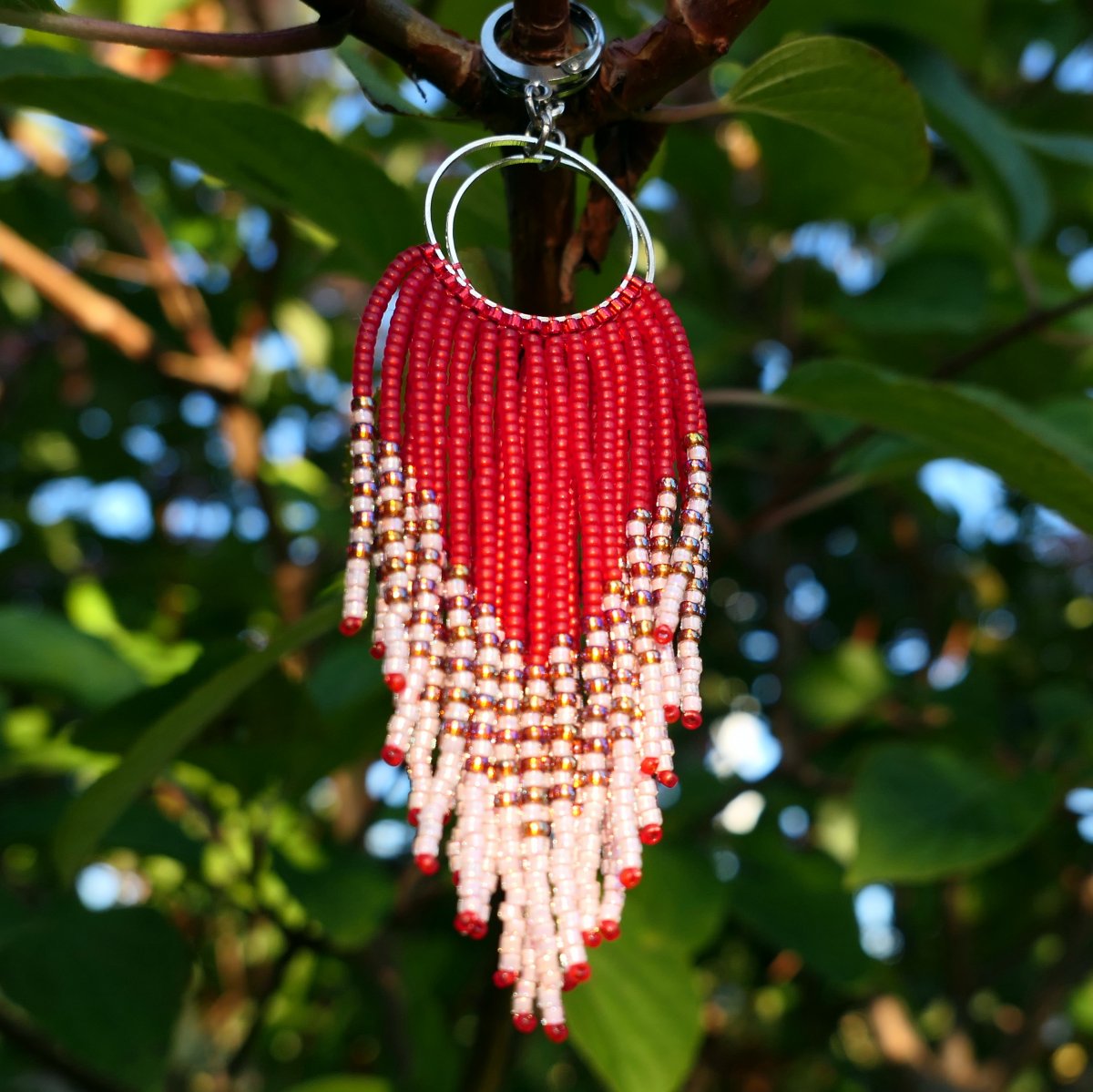 Dlouhé třásňové šité náušničky šířky 3 cm, zhotovené v nerez kruhu průměru 2 cm, zavěšené na uzavřených kruhových háčcích z nerezu. S korálkovými třásněmi mají náušničky s kruhem bez háčků délku 8 cm, kompletní délka 9,9 cm.