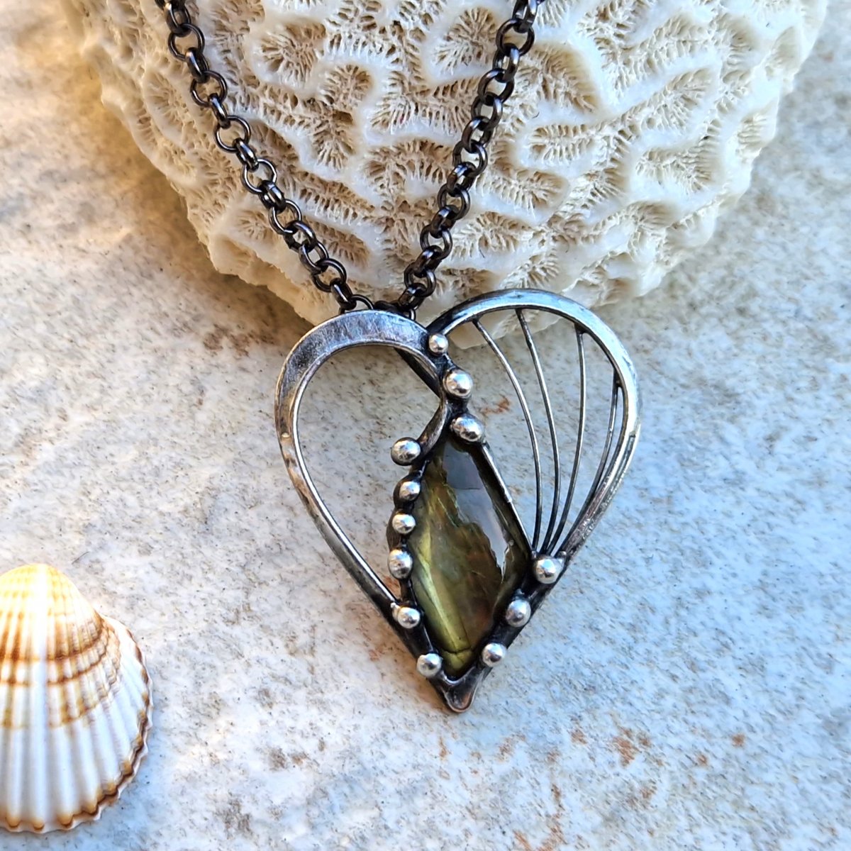 Cínovaný, patinovaný, následně leštený náhrdelník z krásně vybarveného kabošonu labradoritu