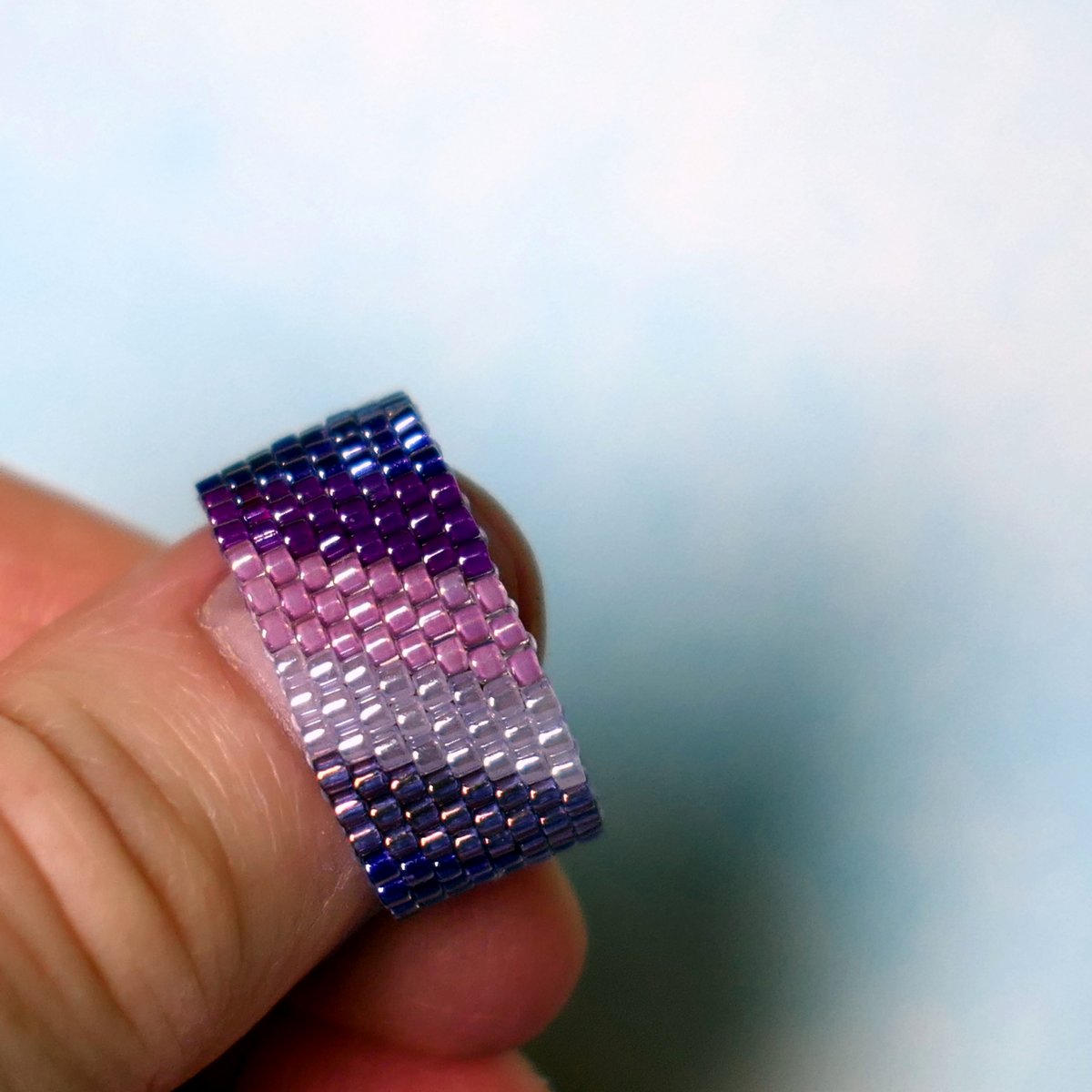 Šitý prsten z velmi kvalitních japonských korálků MIyuki střední velikosti v barvě starorůžové, fialové, modrohnědé vínové a světlounce fialkové. Vzor je po celém obvodu pro délku 5,5 cm. Pokud je zvolena správná velikost, prsten se neprotáčí. Šířka prstenu 1,0 cm.