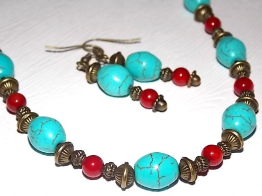 Náhrdelník a náušnice z červeného korálu, tyrkenitu a kovových korálků