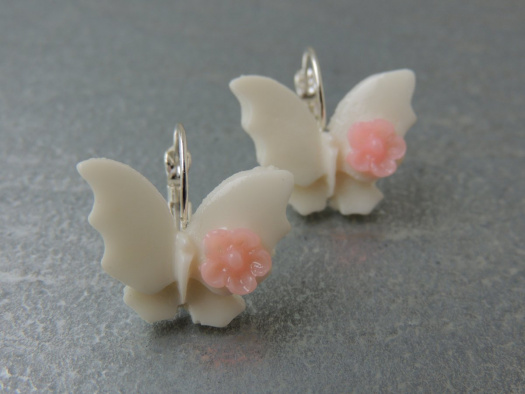 Náušnice s motýlem a drobným kvítkem na křídle - materiál resin. Vel. motýla v nejširším místě 25 mm x 20 mm. Kovové komponenty v barvě stříbrné, bižuterní kov, bez niklu, náušnicový háček uzavíratelný.