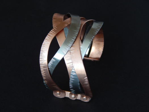 Tepaná měď a nerez.ocel.Spojeno měděnými nýty. Rozměr 60x55mm,šířka 40mm.