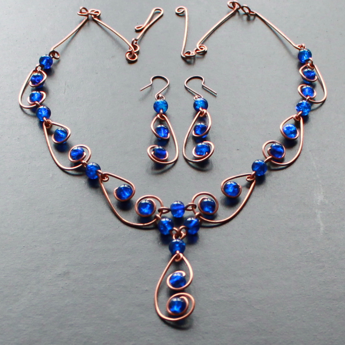 Drátovaný náhrdelník a náušnice ze staroměděného 1,2 mm drátu a modrých praskaných korálků. Lze i jednotlivě. Velikost korálku cca 0,8 cm.