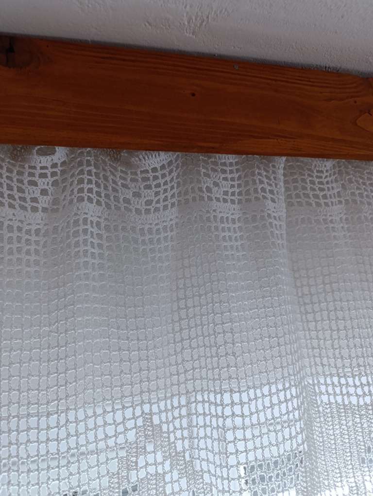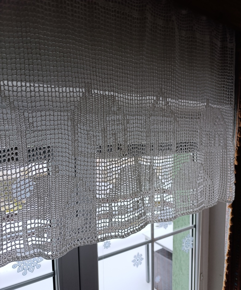 Háčkovaná záclonka z bavlněné příze. Pro pověšení můžete použít žabky nebo tyč. Záclona má v horním kraji otvory pro tyč.