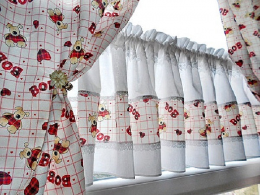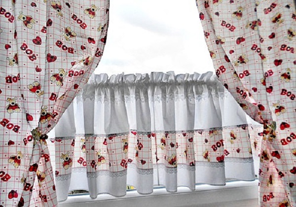Základní látka má podklad bílý, záclonka je doplněna bílým plátnem a bavlněnýma krajkama.