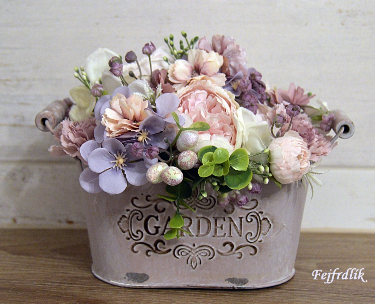 V kovovém zdobeném plecháčku jsou umělé a látkové květiny se zelení a bobulkami.