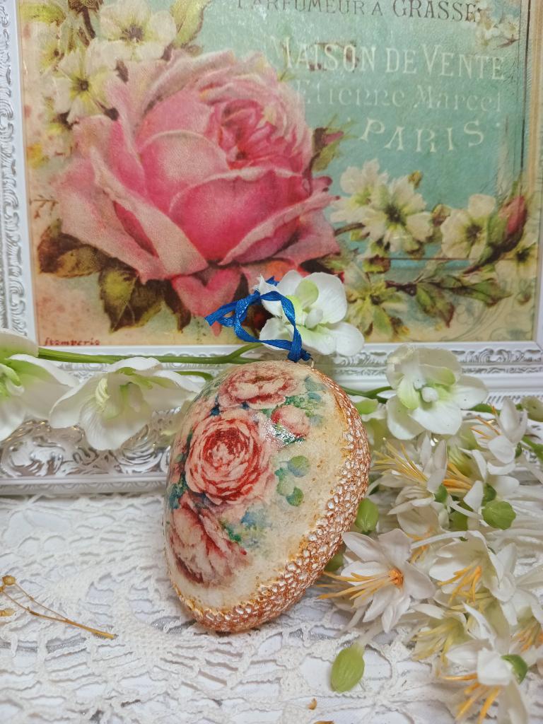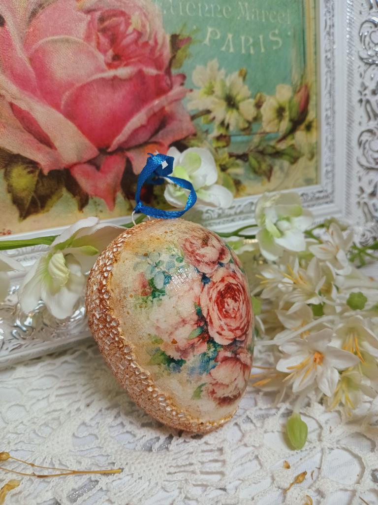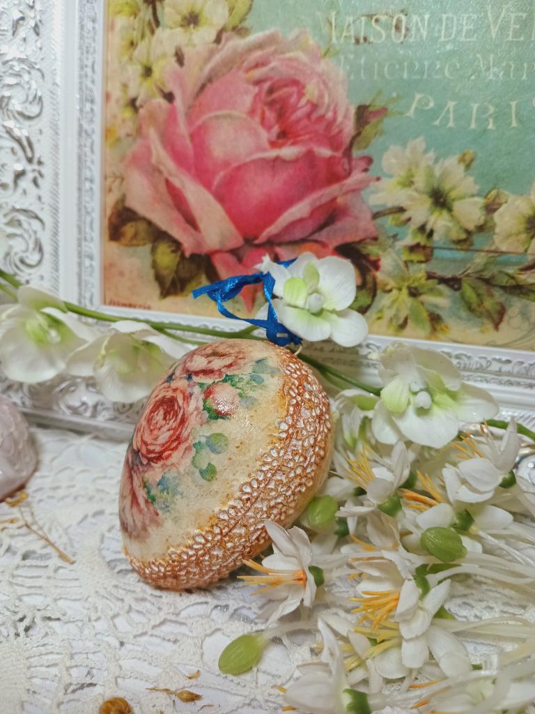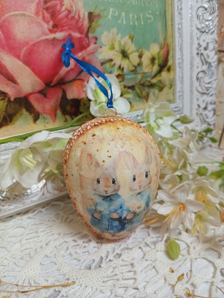 Velikonoční vajíčko s motivy zajíčků a květin. Celé je krakelované a patinované, lakované lesklým lakem. Horní část vajíčka je opatřena očkem a stužkou k zavěšení. Je vhodné k zavěšení na okno, na větvičku, do věnce, dekorace, nebo jen volně položené.