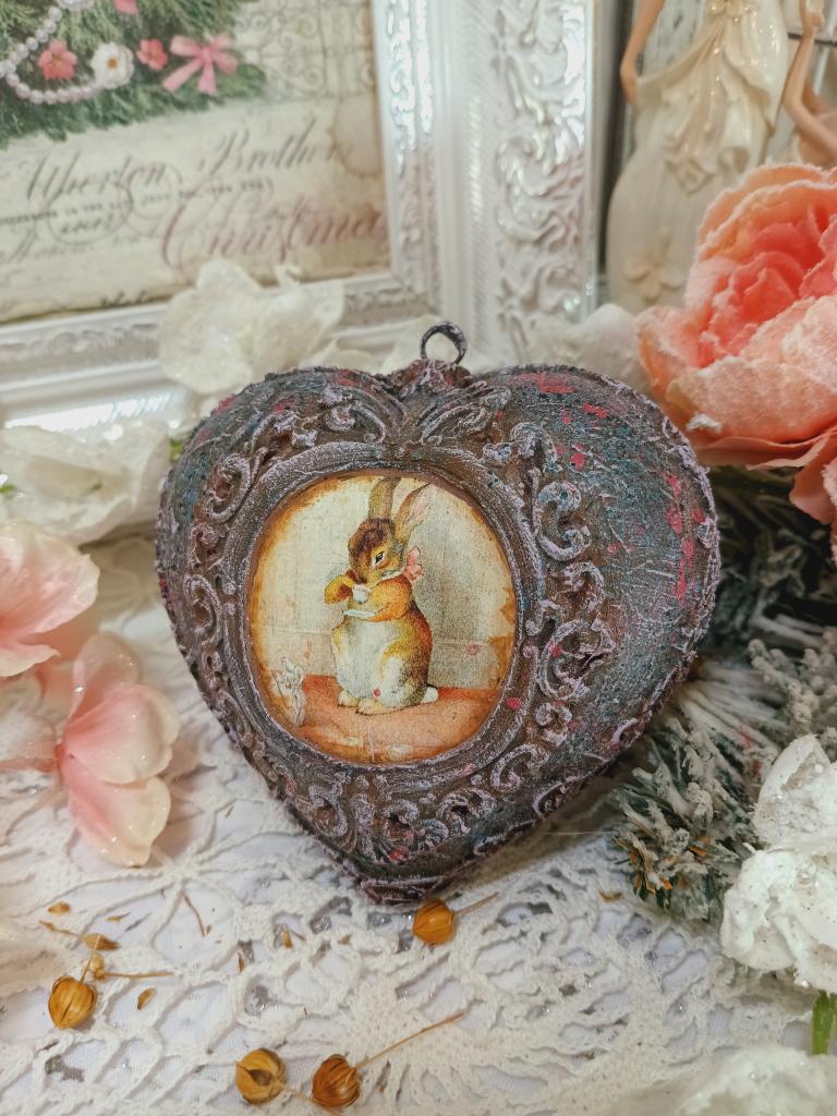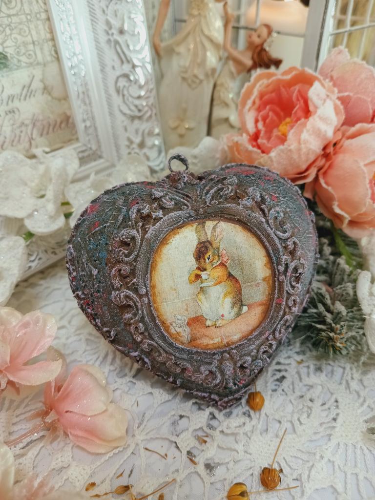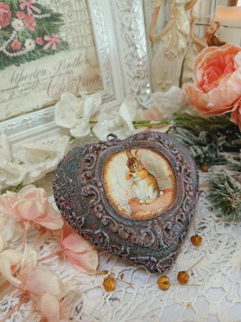 Dekorace srdíčko s motivem zajíčka a modrého motýlka. Okolo hlavního otivu je vytvořena bordura a okolo obvodu srdíčka reliéfní ornamenty. Celé srdíčko má vytvořené reliéfní povrch a je barveno více barvami, poté je patinované.