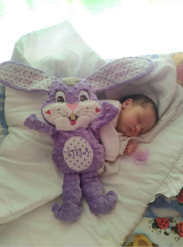 Zajíček vyšitý v rámečku (ITH) na papírovém trhacím podkladu, jako památka děťátku k jeho narození