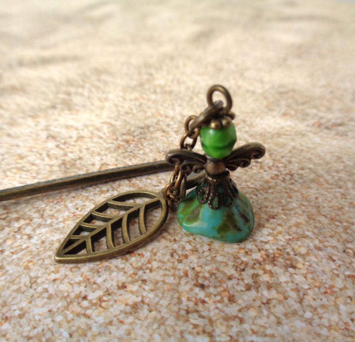 Kovová zdobená záložka do knihy v bronzové barvě s andílkem ze skleněných zelenohnědých korálků. Doplněna je lístkem také bronzové barvy