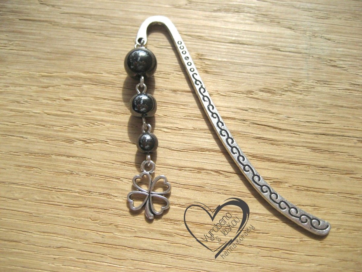 Kovová záložka do knížky, knihy, bloku s minerálem hematit + čtyřlístek pro štěstí, krásný dárek pro každého (nejen) náruživého čtenáře a knihomila, délka záložky 8,5cm.
