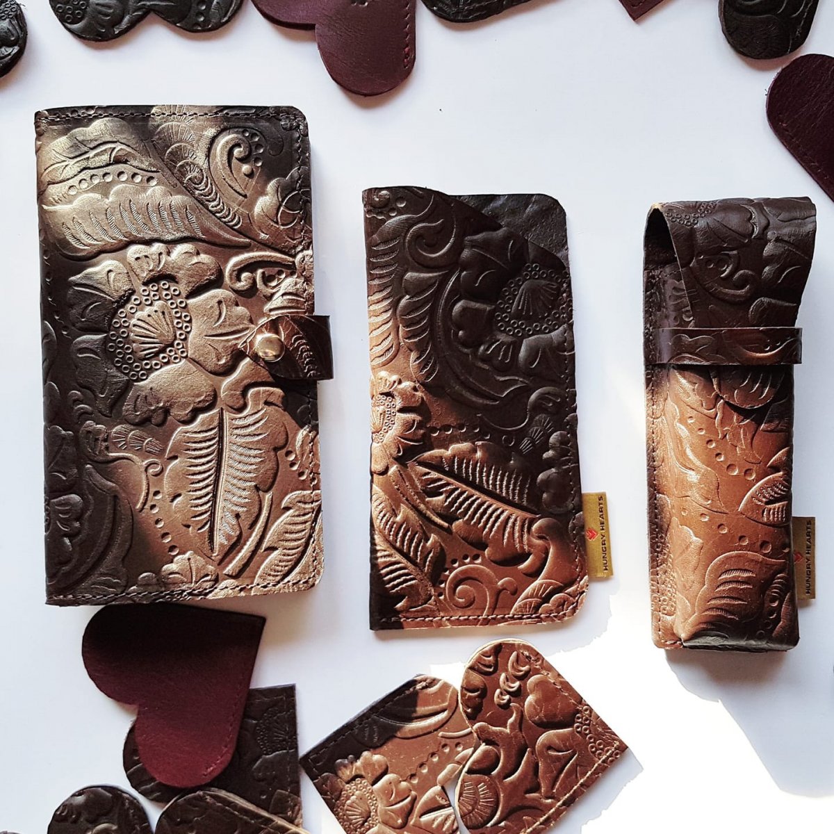 Vyrobená z čokoládově hnědé kůže s vytlačeným květinový reliéfem.