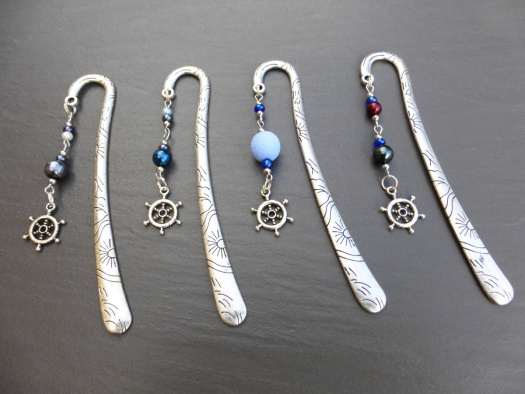 Záložka do knihy s kovovým přívěskem kormidla a voskovanými, skleněnými a kovovými korálky. Délka záložky 12 cm, kovové komponenty stříbrné barvy.