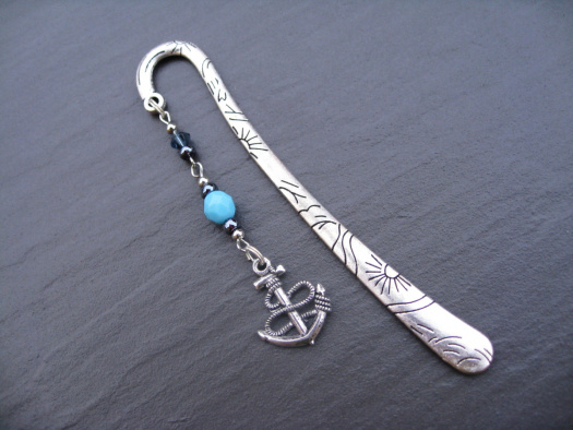 Záložka do knihy s kovovým přívěskem kotvy a skleněnými a kovovými korálky. Délka záložky 12 cm, kovové komponenty stříbrné barvy.