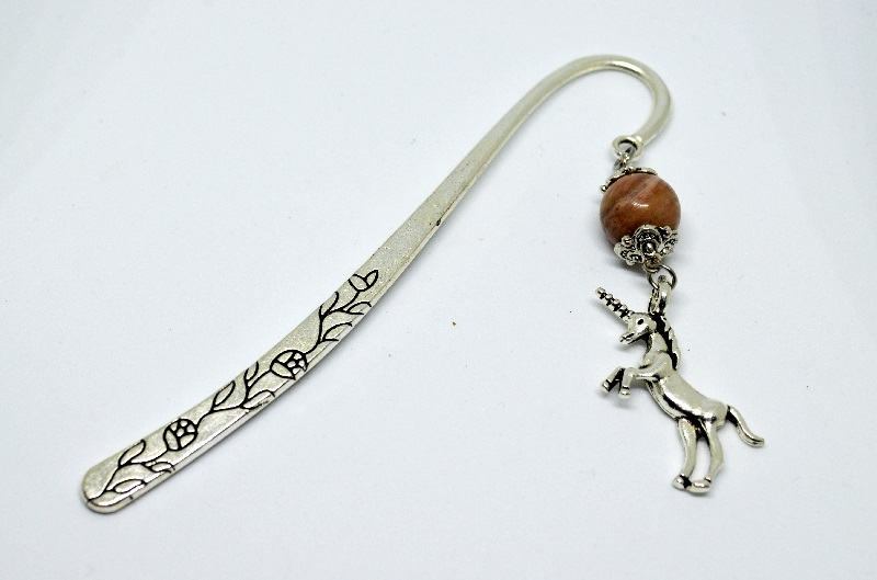 Kovová záložka do knihy s korálkem rodonitu a jednořožcem