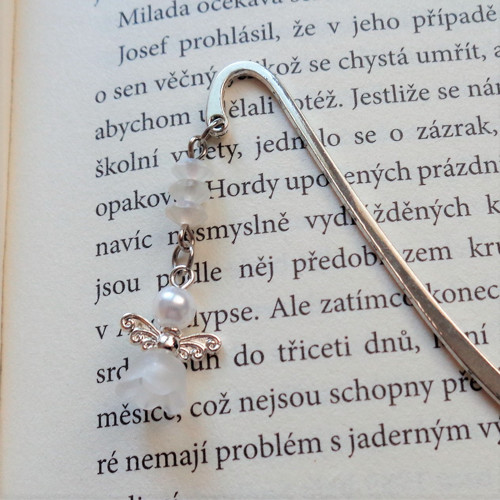 Kovová záložka do knihy ve stříbrné barvě s andílkem, doplněna je skleněnými korálky s duhovým efektem.