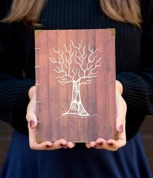 Dosky sú potiahnuté tmavohnedým archivačným papierom s dizajnom dreva a ilustrované kresbou stromu. Dosky zápisníka sú z pevnej knihárskej lepenky. Šitá knižná väzba je urobená tak, aby sa zápisník dobre otváral.