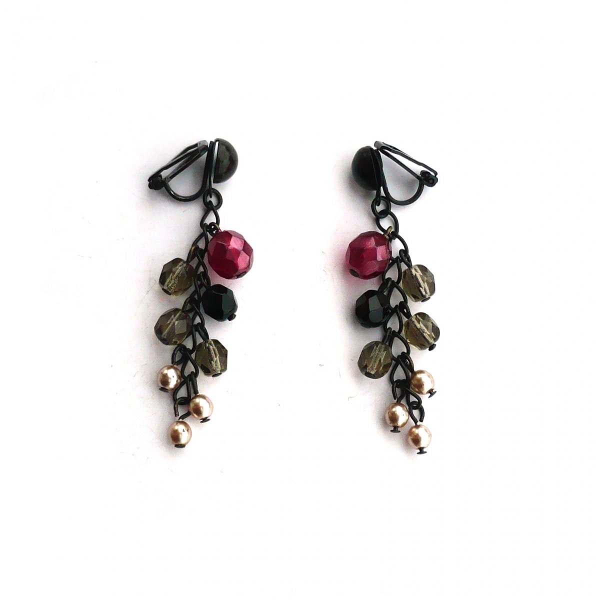 Náušnice jsou z broušených skleněných korálků a českých voskovaných perliček, které jsou uspořádané do jemného hrozínku.
