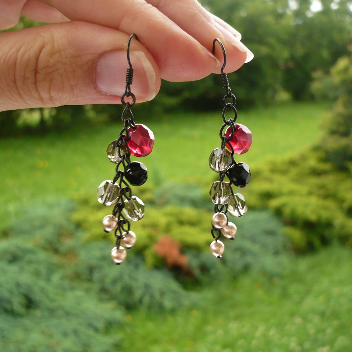 Náušnice jsou z broušených skleněných korálků a voskovaných českých perliček, které jsou uspořádané do jemného hrozínku.