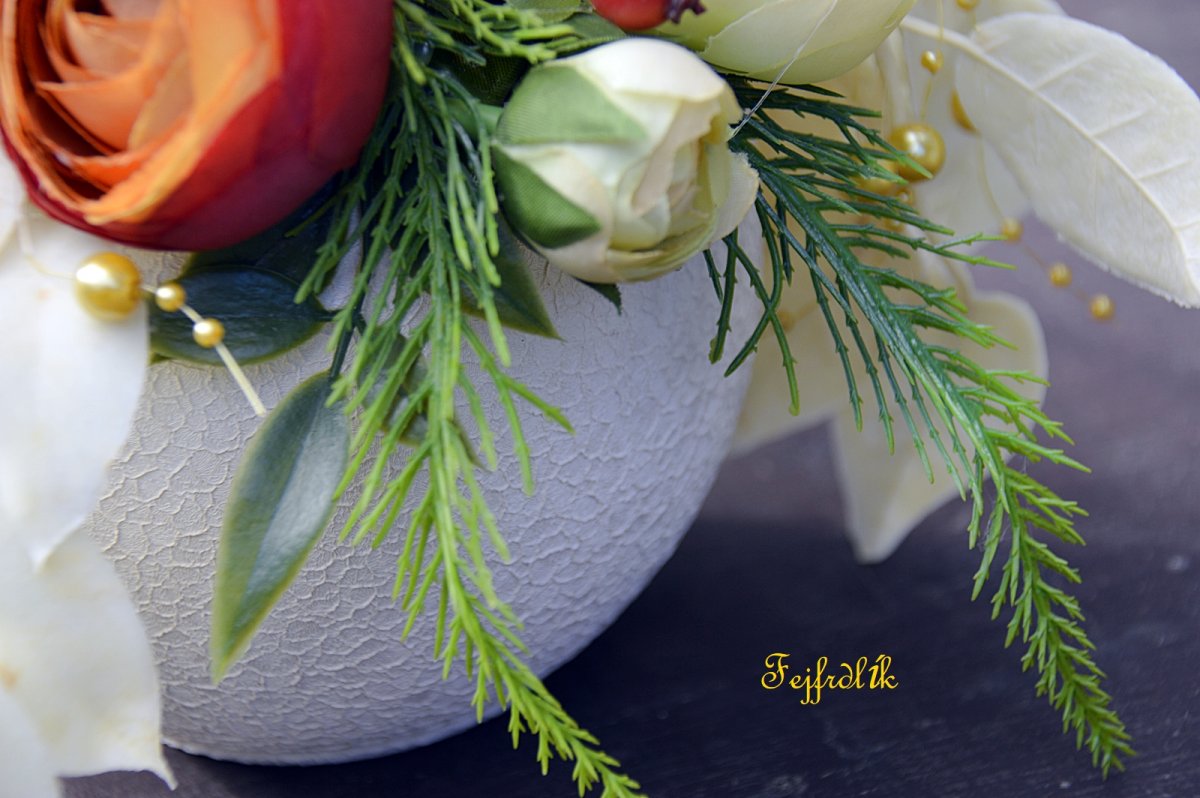 Květinová dekorace v bílé keramické kouli s umělými květy a zelení a korálky.