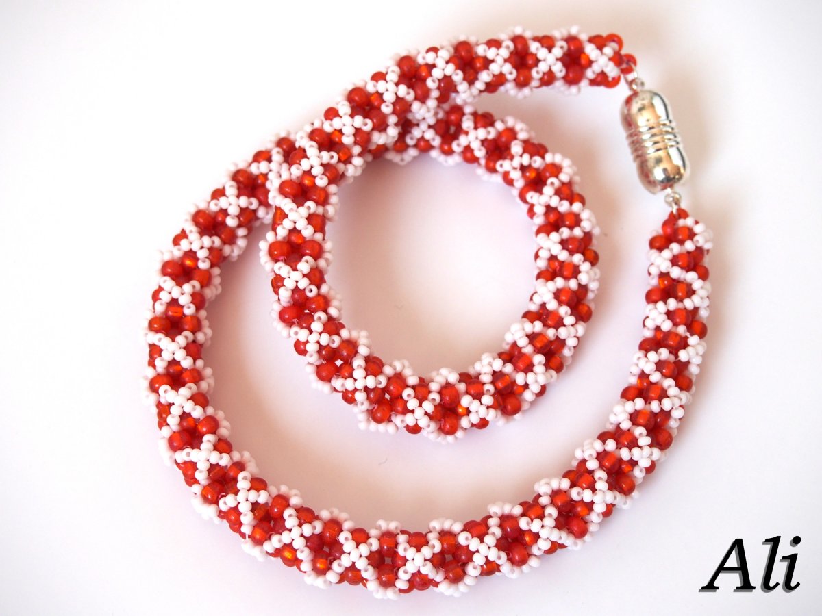Krásný jednoduchý náhrdelník - dutinka ušitá z českých rokajlových korálků Precioza. V elegantní červenobílé-kombinaci.