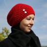 Hrubšia háčkovaná čiapka predĺženého strihu vo výraznej červenej farbe.