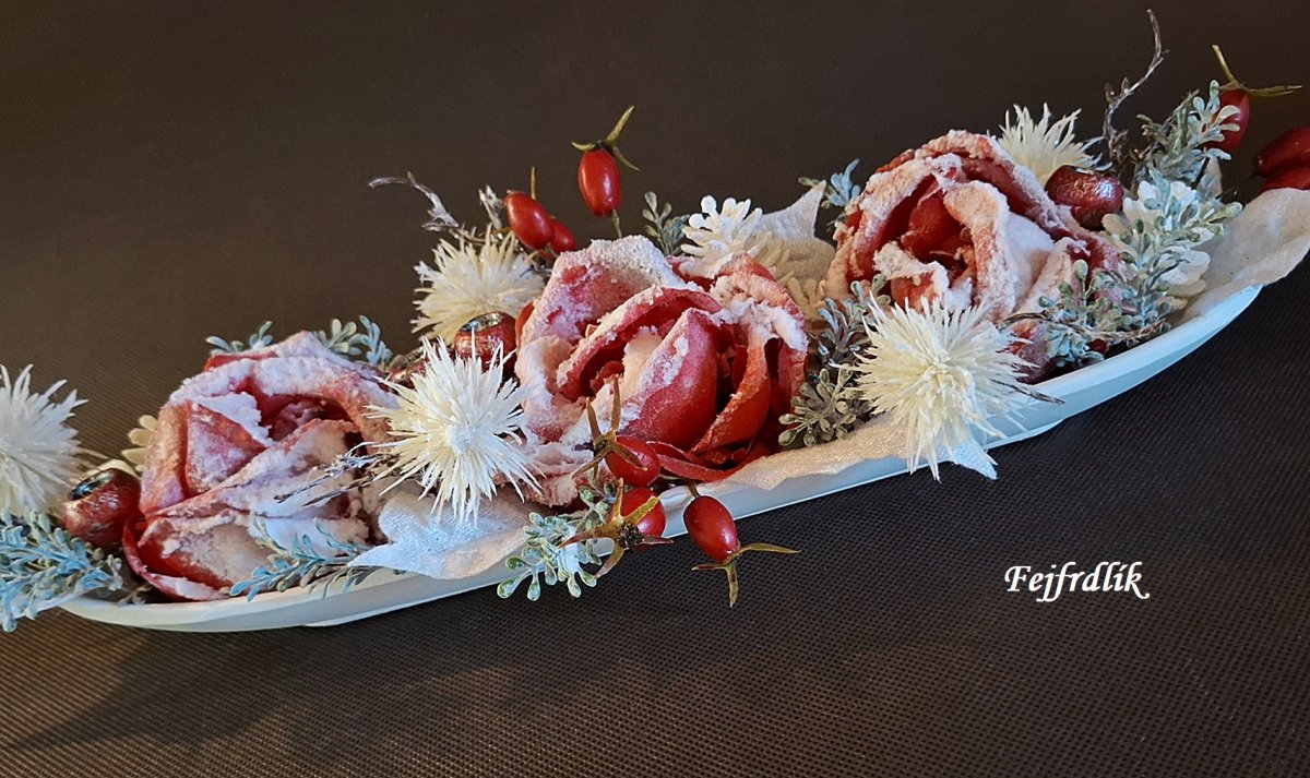 Zimní dekorace s třemi umělými zasněženými růžemi , umělými šípky a ost.přízdobami na tácu (dřevoplast).