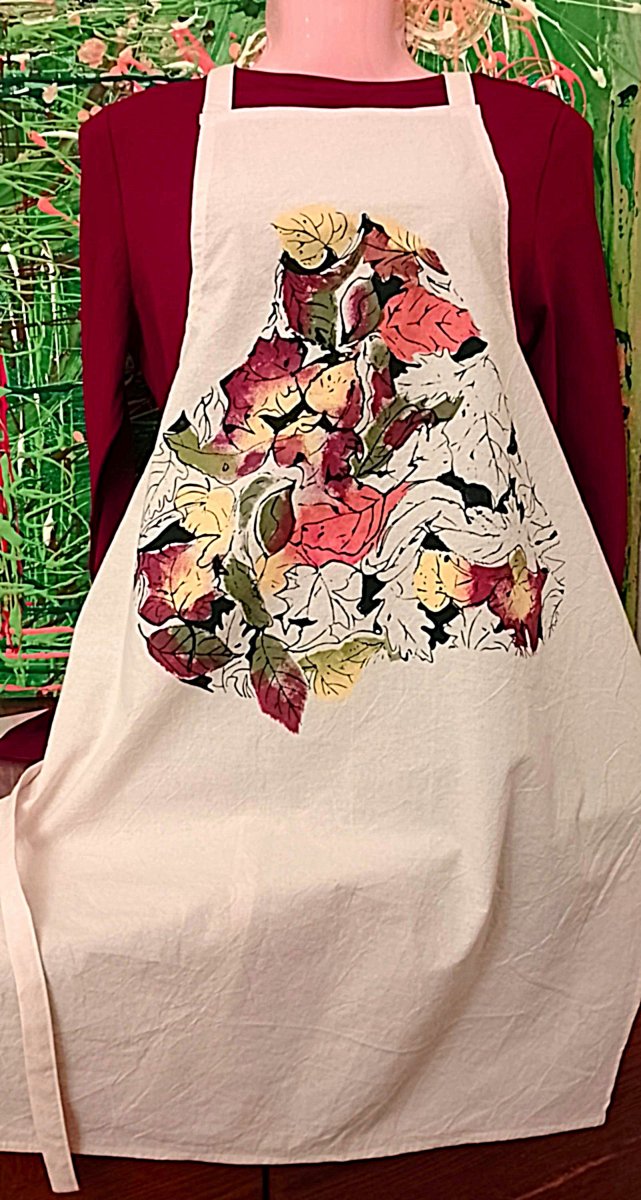 Barevný podzim v kuchyni si navodíte s ručně šitou kuchyňskou zástěrou z lněného plátna a originálním motivem spadaného listí.