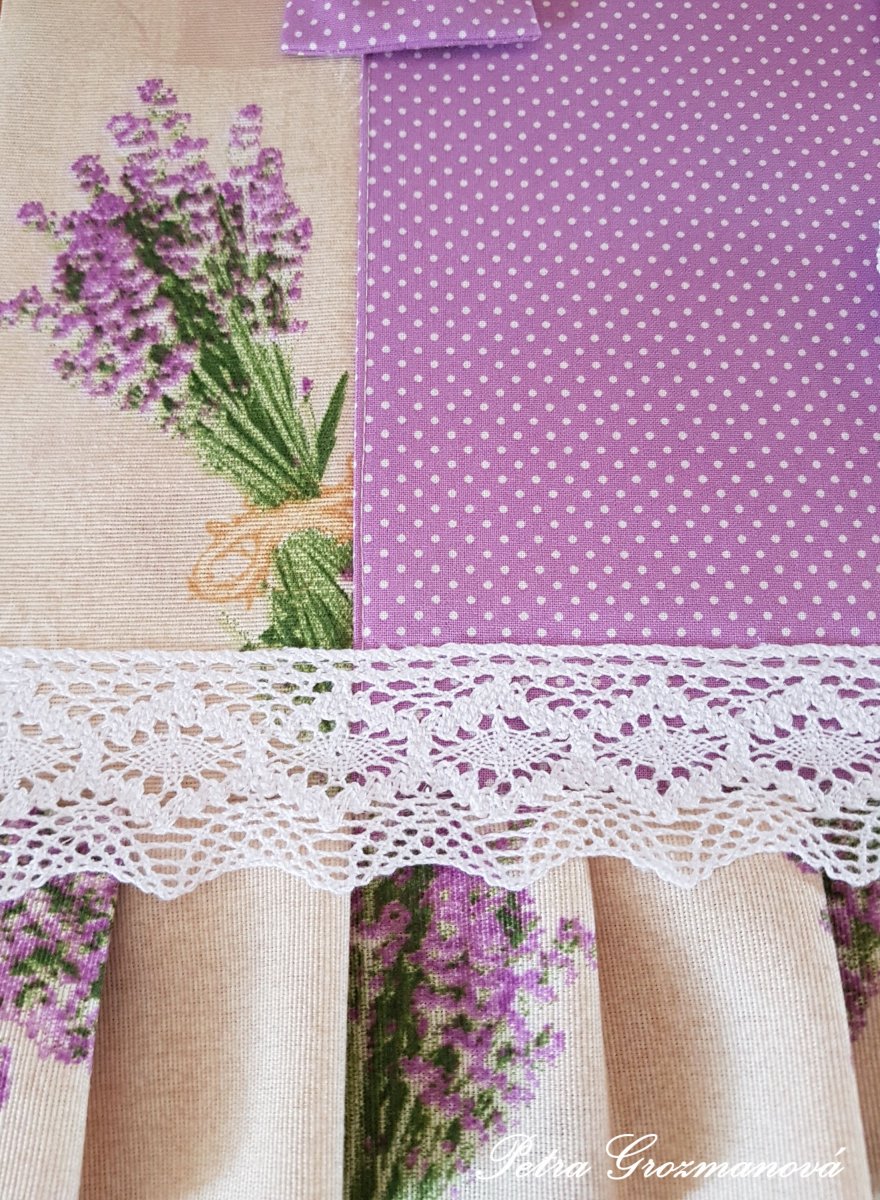 Závěs na troubu v přírodním provedení s motivem levandule, lemovaný bílou krajkou šíře 45 mm