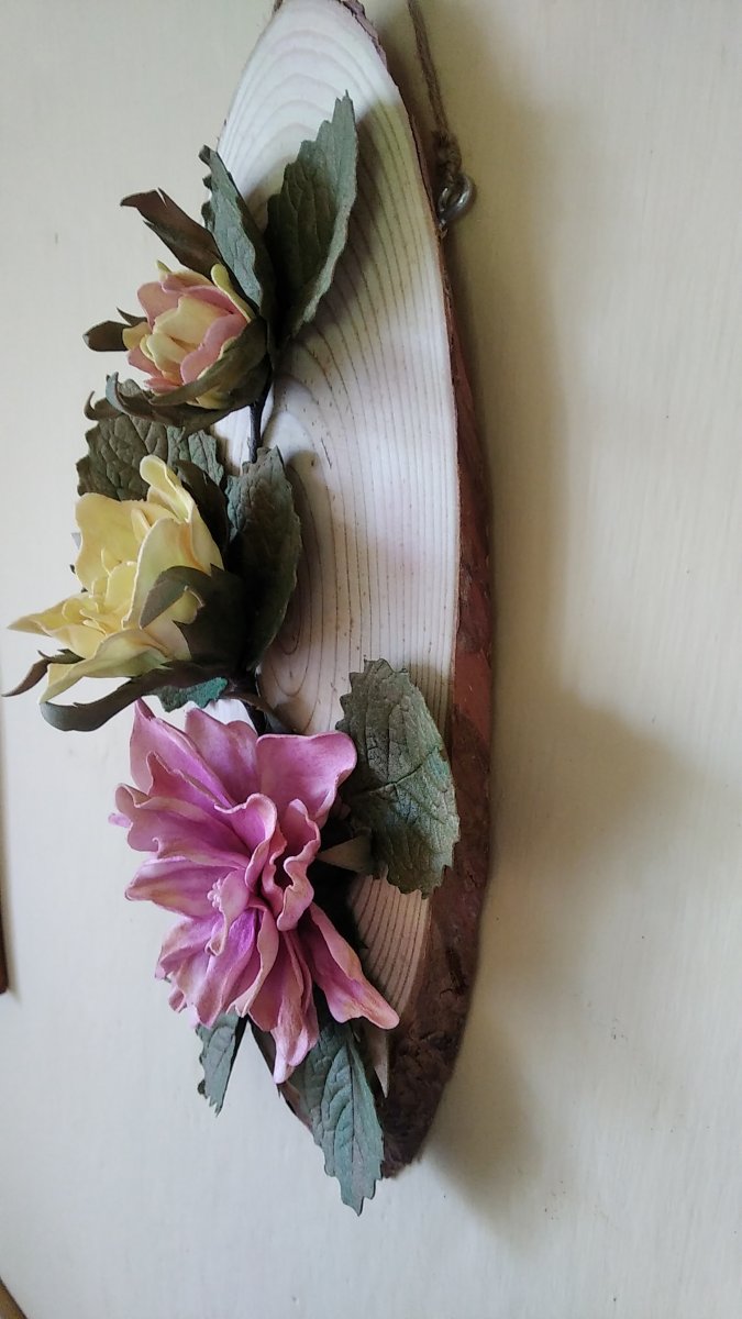 Dřevěný ovál ozdobený květy a listy z foamiranu. Květy jsou ručně vystříhány, nahřáty a tvarovány, listy vznikly pomocí žilkovače. Vše je barveno olejovými barvami, pastely nebo panpastely.