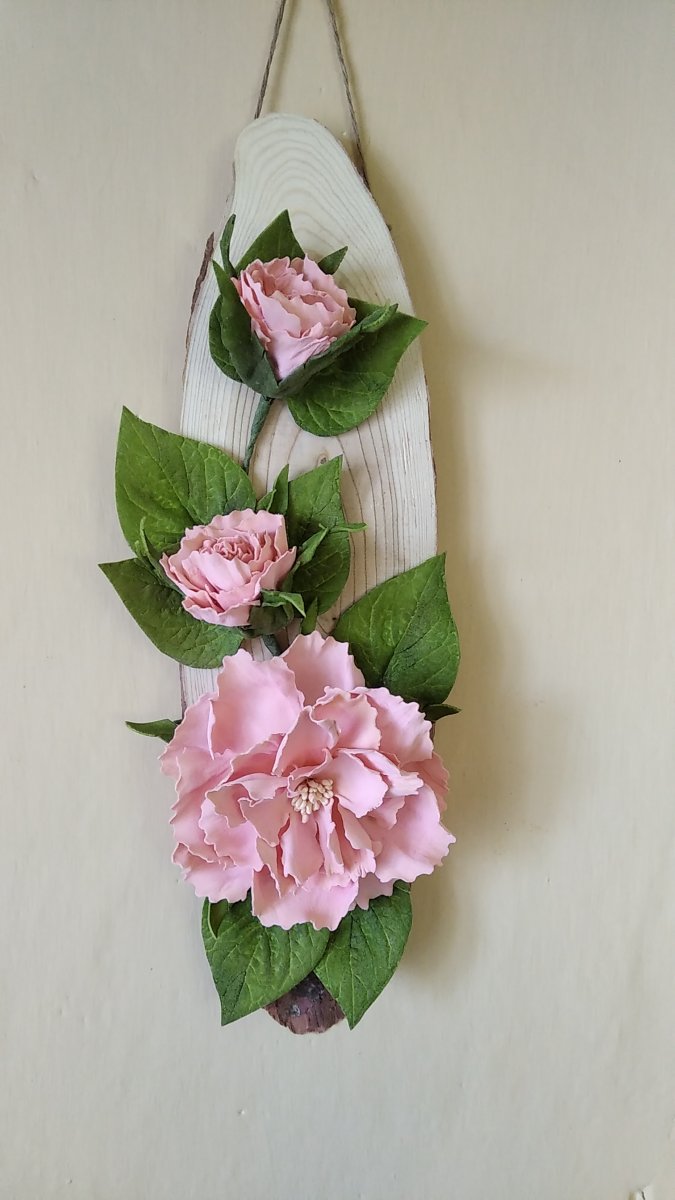 Dřevěný ovál ozdobený květy a listy z foamiranu. Květy jsou ručně vystříhány, nahřáty a tvarovány, listy vznikly pomocí žilkovače. Vše je barveno olejovými barvami, pastely nebo panpastely.