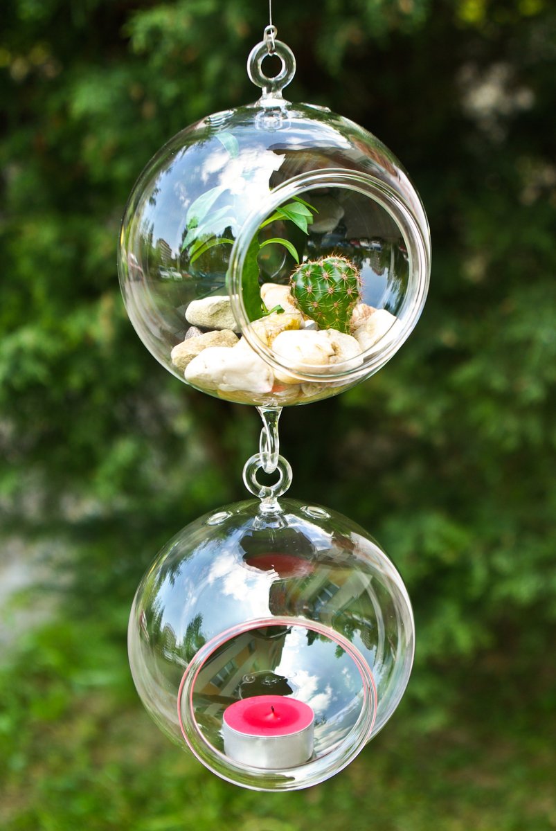 Lze použít i jako závěsná vázička nebo svícen na čajovou svíčku.Koulička je vyrobena z tepelně odolného (varného) skla SIMAX.