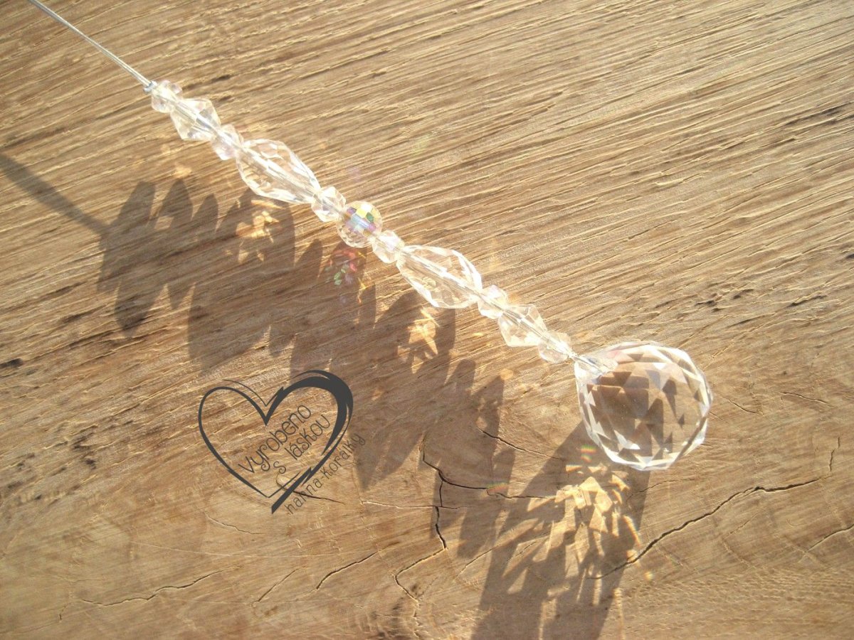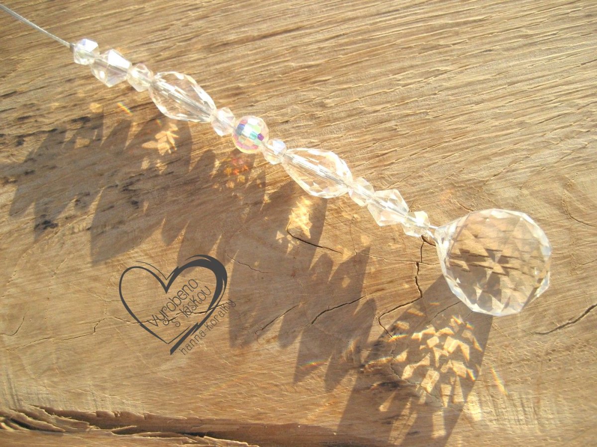 Duhový Feng Shui závěs je vyrobený z broušené koule 2cm a broušených korálků v bílém – čirém provedení, vše je zavěšeno na dvojitém, ocelovém lanku s očkem - v délce – 35cm, 55 cm nebo 75cm dle vašeho výběru - do poznámky k objednávce napište požadovanou délku. Součástí tohoto závěsu je dárkový pytlík z organzy nebo je za příplatek 40,-Kč dárková krabička s dřevitou vlnou, uvedená cena za kus.