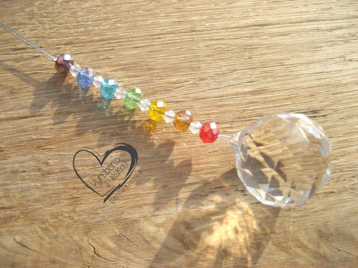 Duhový Feng Shui závěs je vyrobený z broušené koule 3cm a broušených korálků v čakrovém – barevném provedení, vše je zavěšeno na dvojitém, ocelovém lanku s očkem - v délce – 35cm, 55 cm nebo 75cm dle vašeho výběru - do poznámky k objednávce napište požadovanou délku.