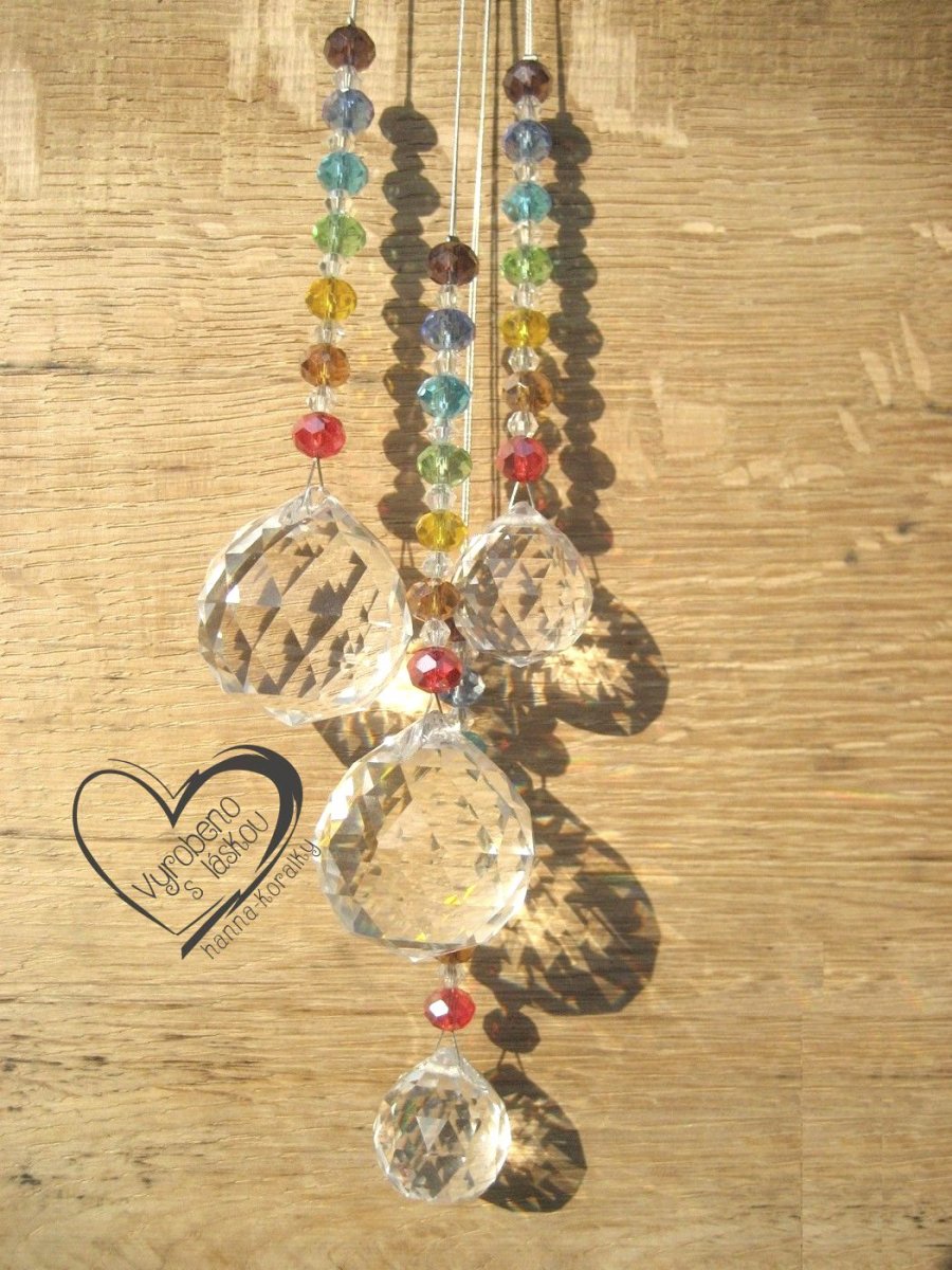 Závěsné Feng Shui křišťály jsou vyrobeny z broušeného skla a broušených korálků, nejčastěji se zavěšují na okna, ale i terasy a balkóny, kde na ně dopadá nejvíce slunečních paprsků a díky tomu navodí příjemný pocit harmonie a pohody. Přes vybroušené plošky krystalu či koule prochází sluneční světlo a krásně prozáří prostor pozitivní energii, světlem a duhovými odlesky.