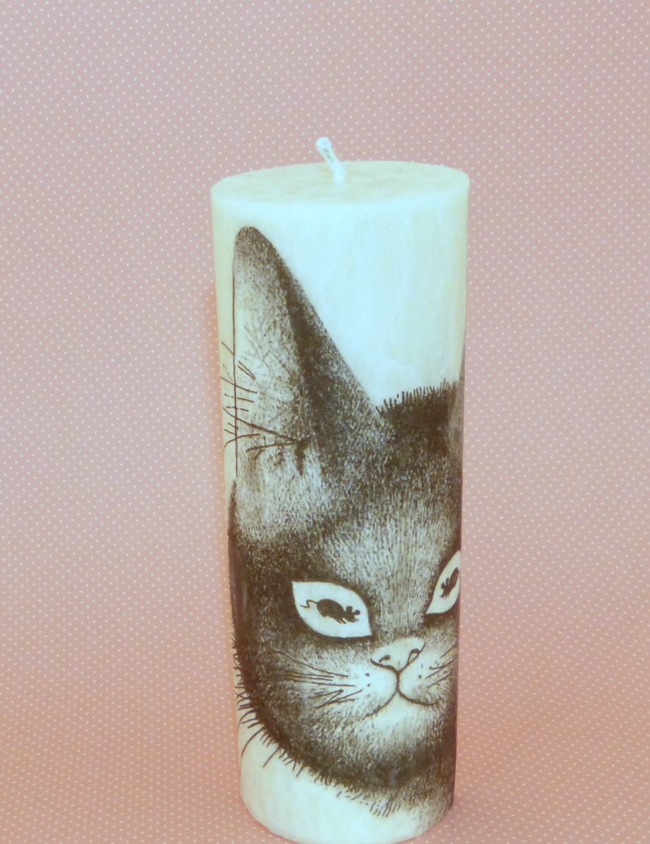 Velká svíčka s kočkou - zdobená metodou decoupage, bez použití lepidla.