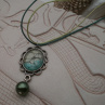 celková velikost přívěšku cca 4 cm, zavěšeno na dvou šňůrkách v tmavě zelené a světle zelené barvě, délka 40 cm.