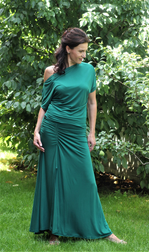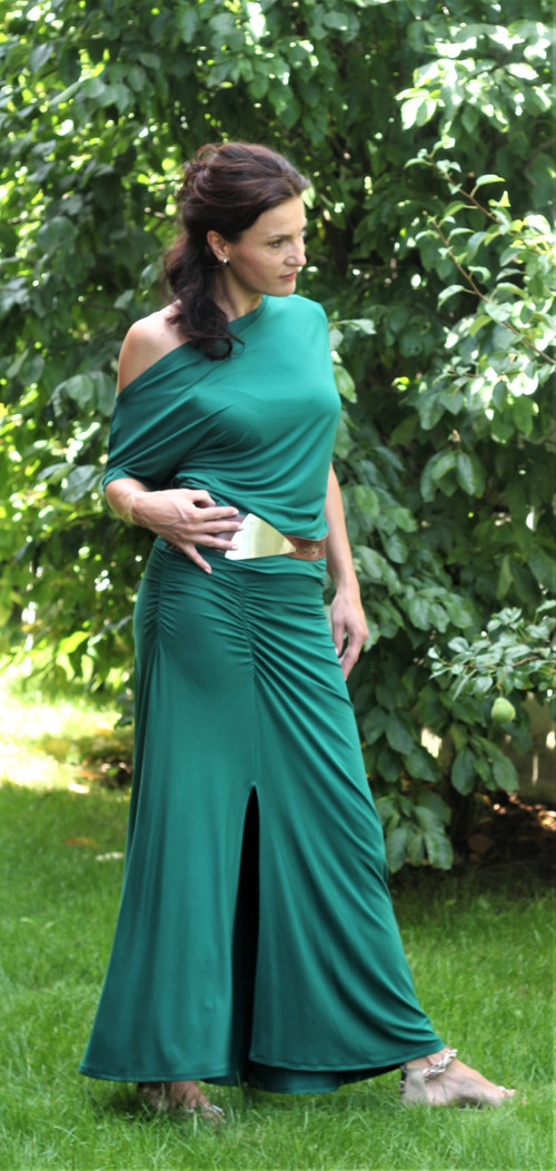 Dlouhá sukně z úpletu viskóza /elastan je na bocéch a na předním díle řasená.