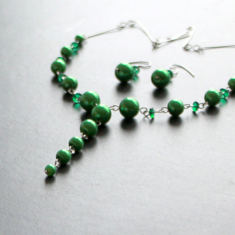 Drátovaný náhrdelník a náušnice z nerezového 0,8 mm drátu se zelenými perlami s více velikostí a s mačkanou čočkou. Lze i jednotlivě.