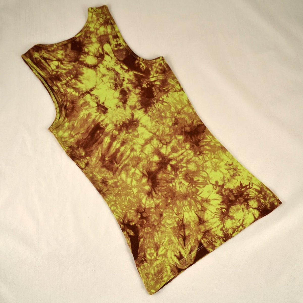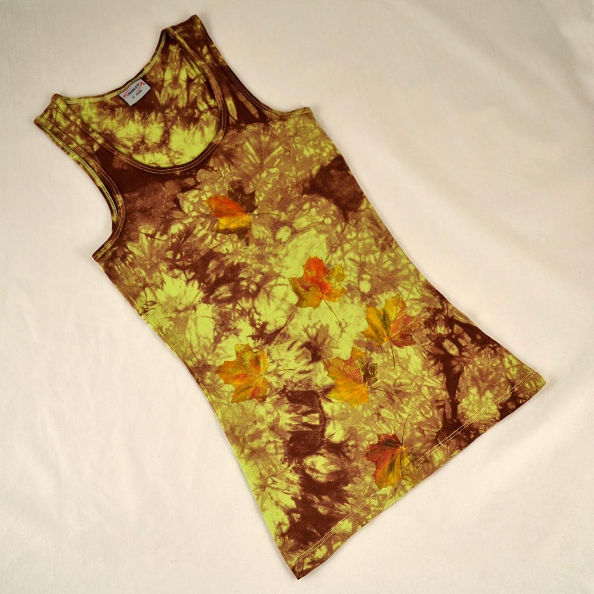 Světle zelené dámské tílko s větším výstřihem, hnědá batika, na přední straně barevné javorové listy, velikost S