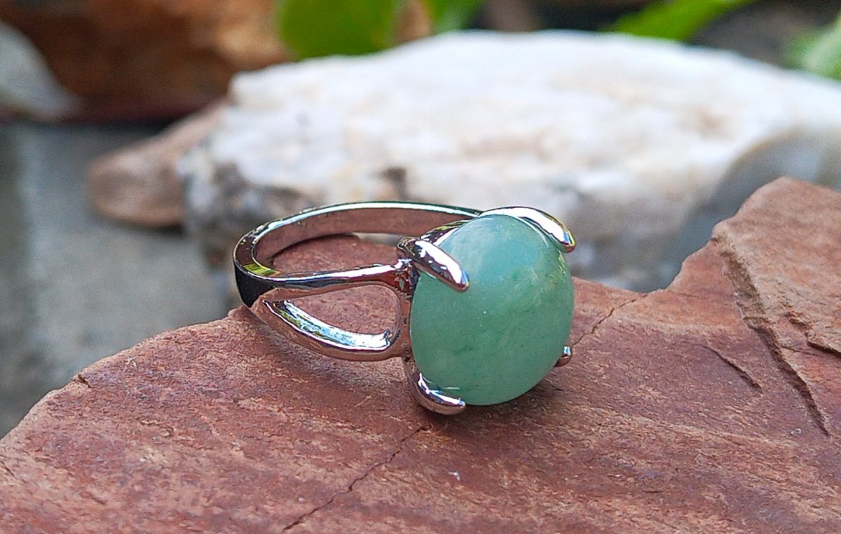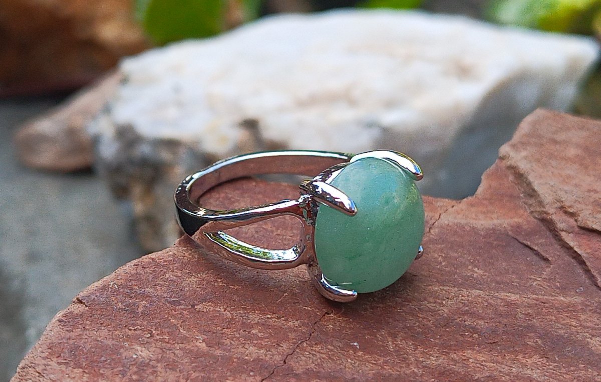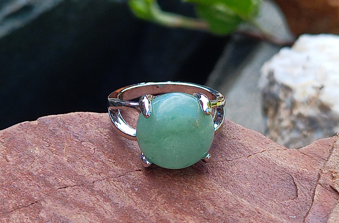 Prstýnek se vsazeným kabošonem zeleného avanturínu o průměru 12 mm v postříbřeném elegantním kroužku.