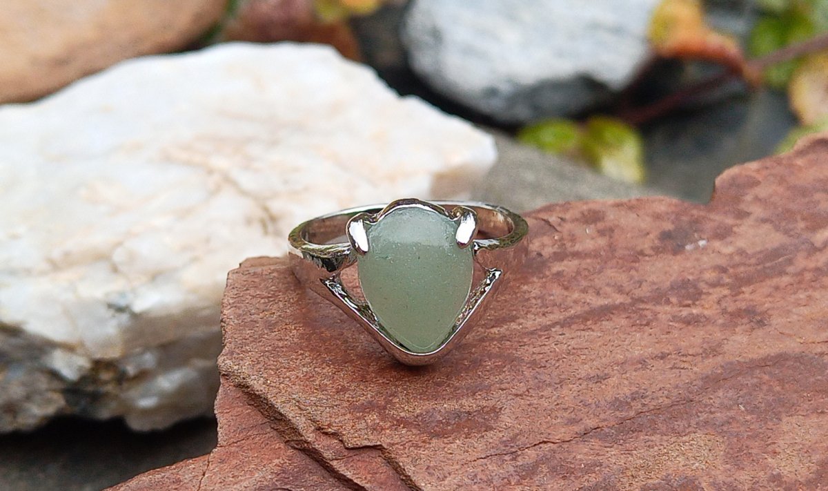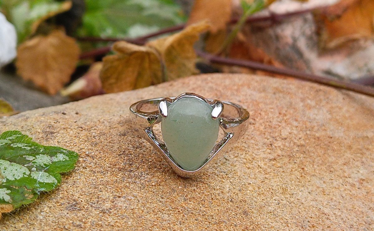 Světle zelený avanturín ve tvaru kapky o velikosti cca 13x10 mm v elegantním postříbřeném prstýnku