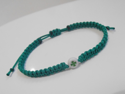 Náramek je vyroben ze zelené šňůrky a korálku se čtyřlístkem.