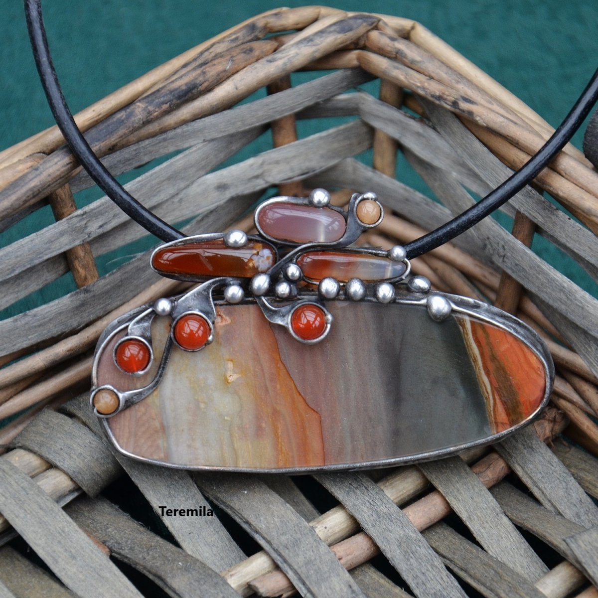 Šperk je vyroben cínováním. Je tvořen jediným obrovským oválným plátkem jaspisu polychrom, který je leštěn z obou stran. Kámen je veliký 8 x 3,5 x 0,8 cm. Barvy kamene jsou unikátní a jedinečné. Béžová se prolíná s různými odstíny hnědé až přejde do šedozeleného odstínu uprostřed, aby se zcela náhle změnila na oranžovo rezavou. barvy jsou příjemné, měkké s plynulými přechody. Jsou jak vrstevnaté části zemské kůry.