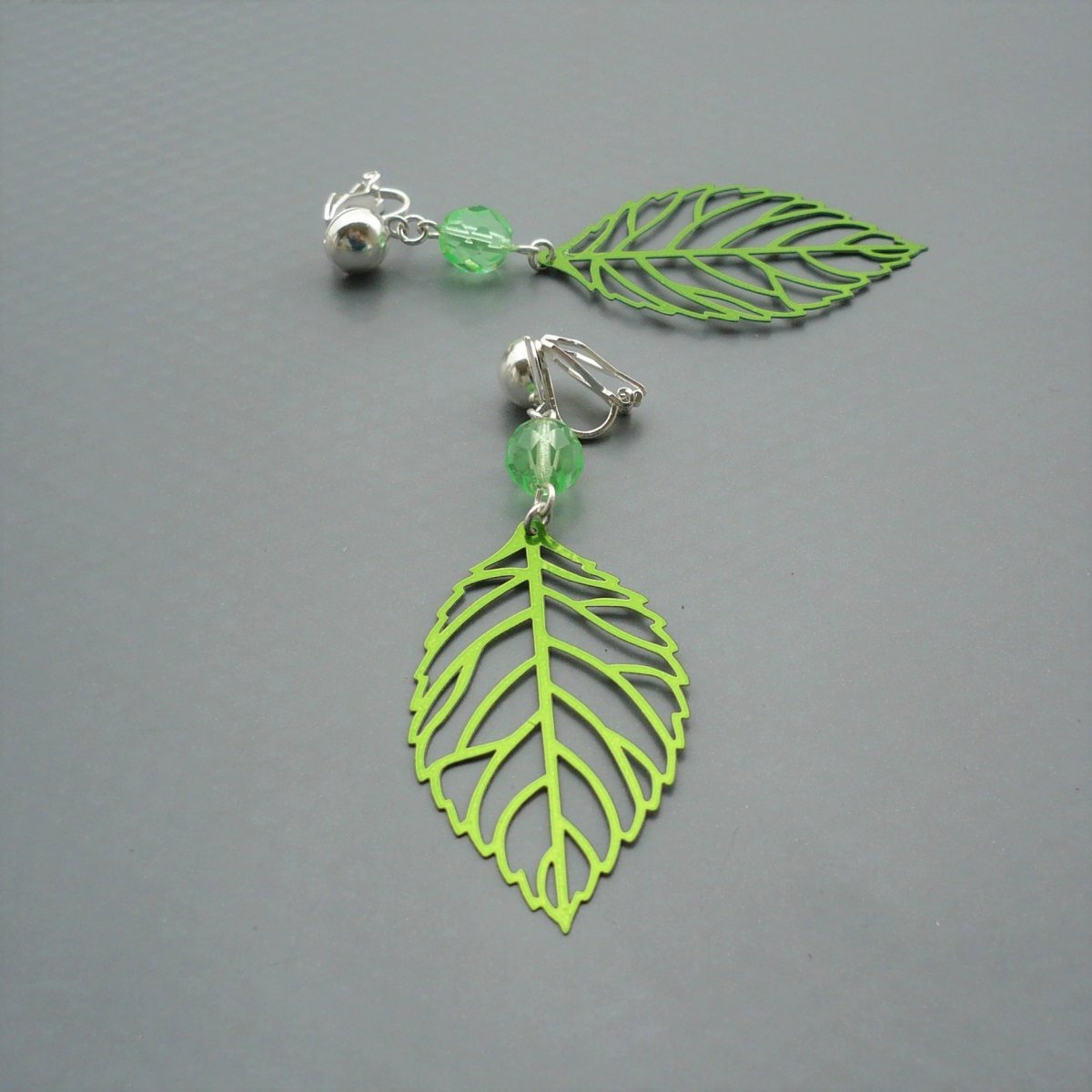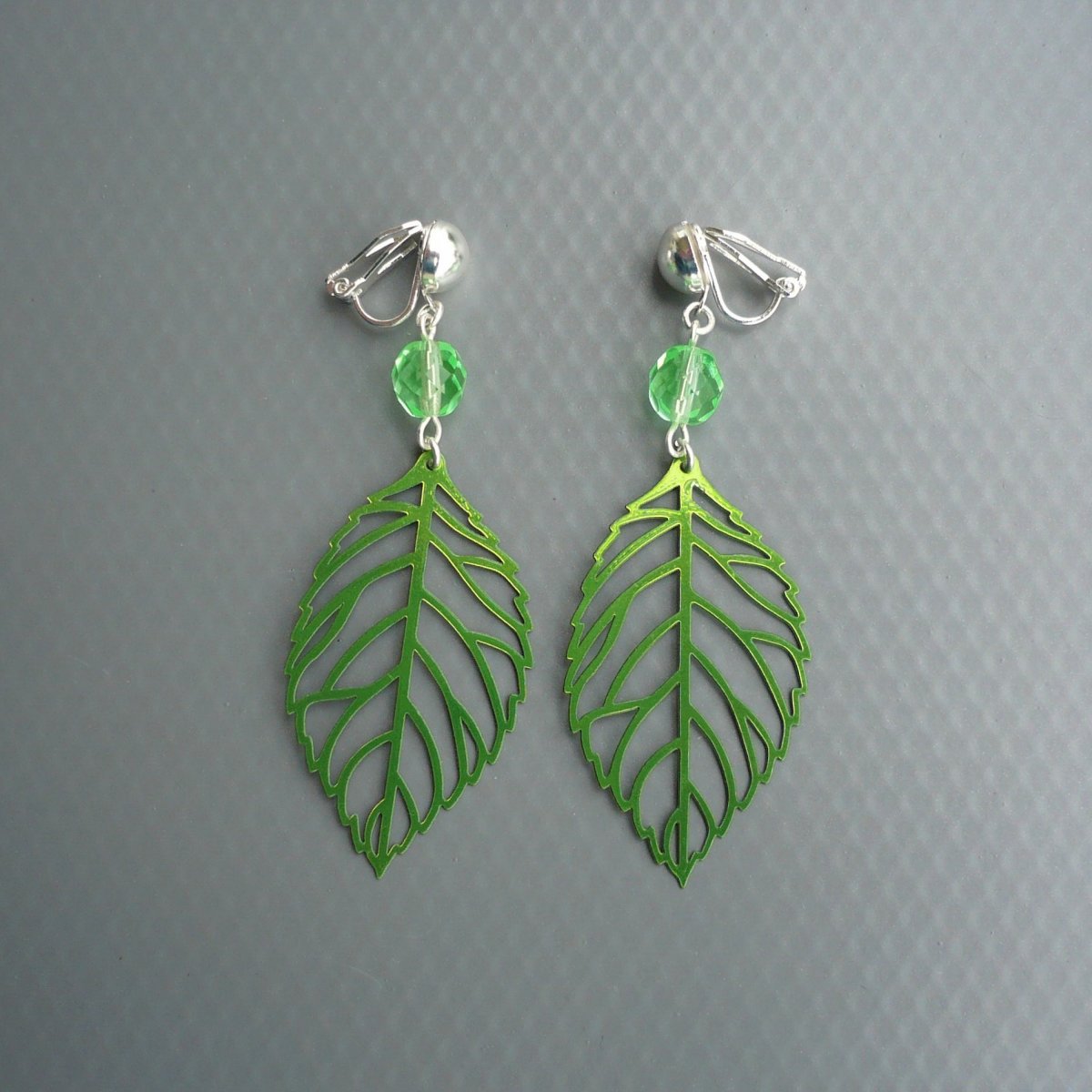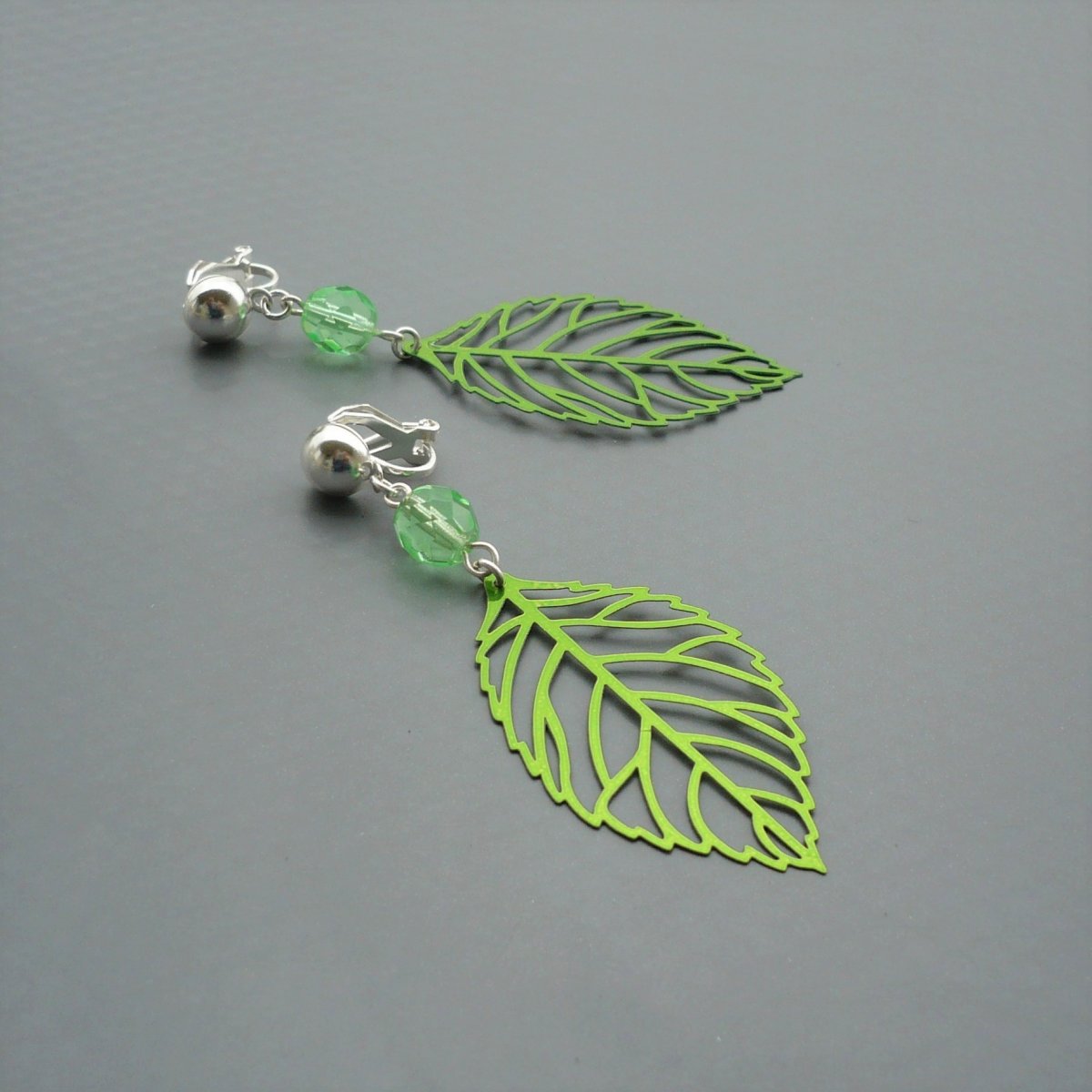 Jednoduché lehoučké klipsové náušnice (není potřeba mít propíchnuté ouško) jsou tvořeny horním světle zeleným broušeným skleněným korálkem a spodním dekorativně vyřezávaným zeleným plíškem ve tvaru listu.