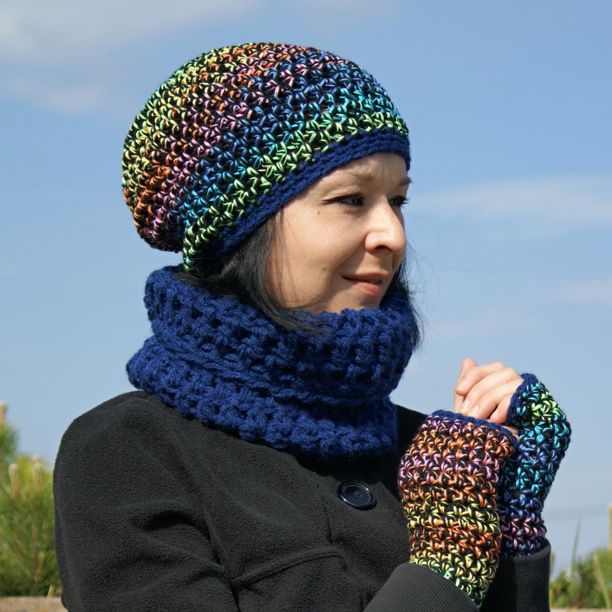 Skladá sa z pestrofarebnej čiapky a bezprstých rukavičiek, ktoré melírujú v dúhových prevažne modro-zeleno-ružových farbičkách a hrubého nákrčníka na jedno prevlečenie modrej farby