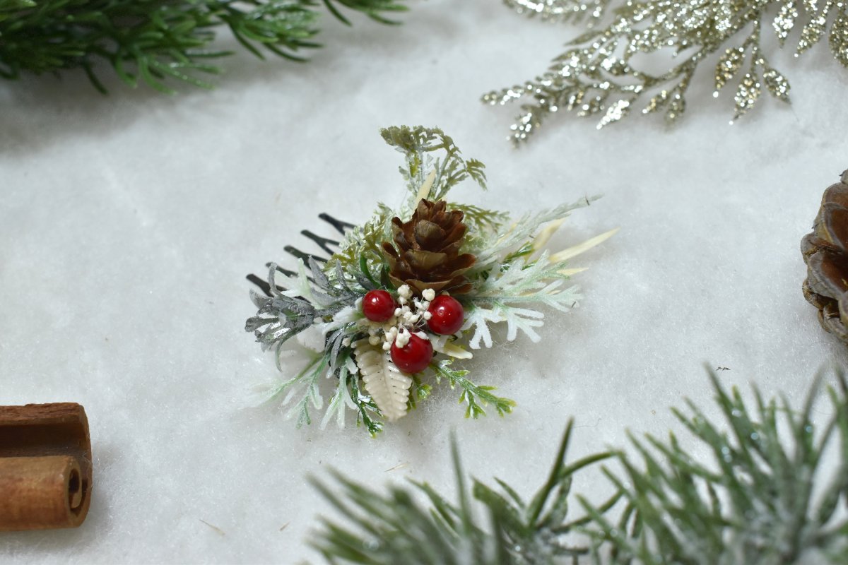 Zimní hřebínek do vlasů zdobený šiškou, červenými bobulkami a uměým jehličím a lístečky. Ozdobí účes všech něžných lesních víl, divoženek a princezen milujících vánoční čas.