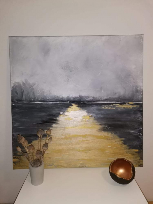 Obraz je malovaný akrylovými barvami na kvalitní bavlněné plátno které je natažené na dřevěný rám. Velikost obrazu je 80X80cm.