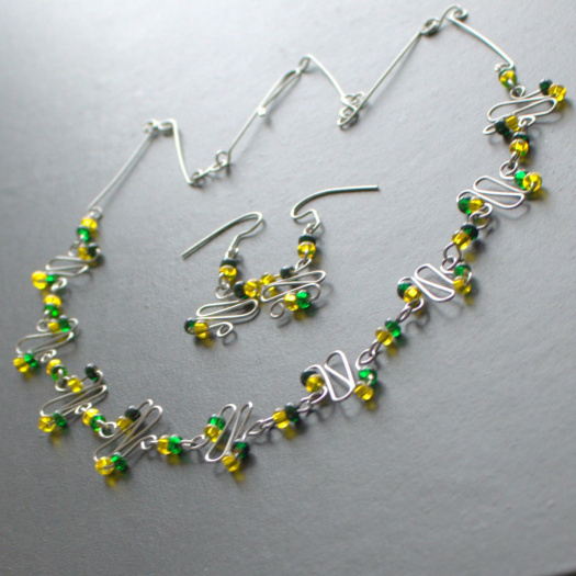 Drátovaný komplet z černého drátu se žlutími a zelenými rokailovými korálky. Velikost korálku cca 0,4 cm.