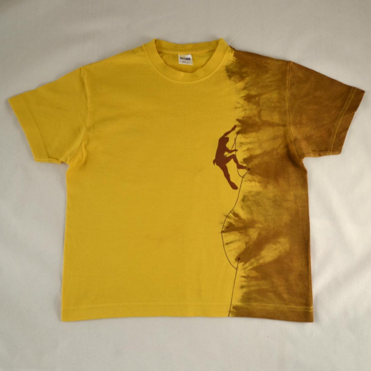 Dětské tričko v kombinaci žluté a hnědé barvy s motivem horolezce na přední straně, velikost na 8 let (širší střih).